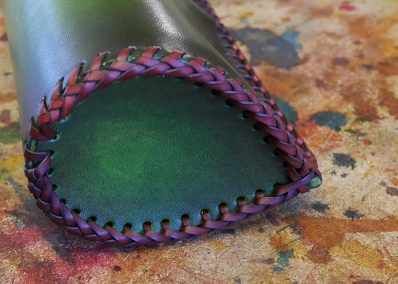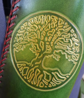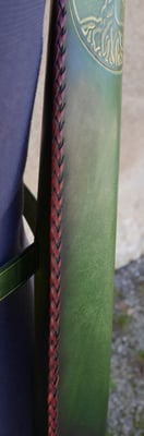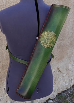 Créations · 26. février 2018 Carquois Carquois arbre de vie Carquois en cuir tannage végétal 1,8 mm d'épaisseur. Circonférence : 25 cm Motif repoussé proposé par la cliente. Teinture base aqueuse. Tressage espagnole à deux boucles en lacet de kangourou. Couture main point sellier. Prix : 180 euros tagPlaceholderCatégories : nouveaute-creation Écrire commentaire Commentaires: 0