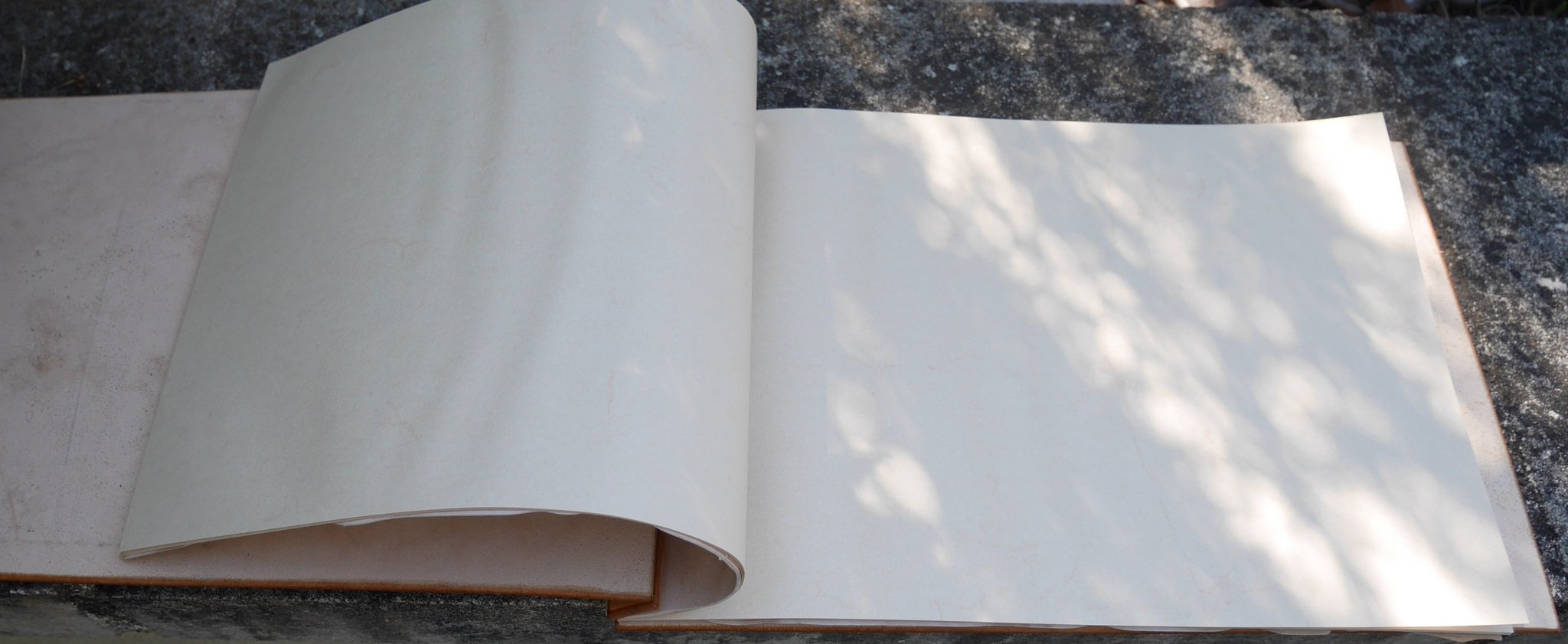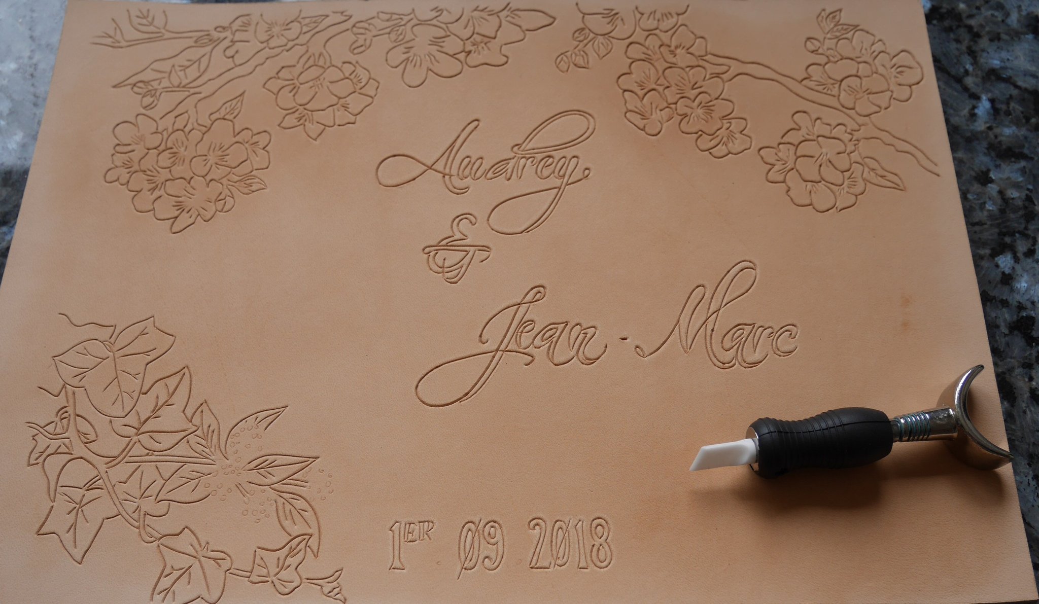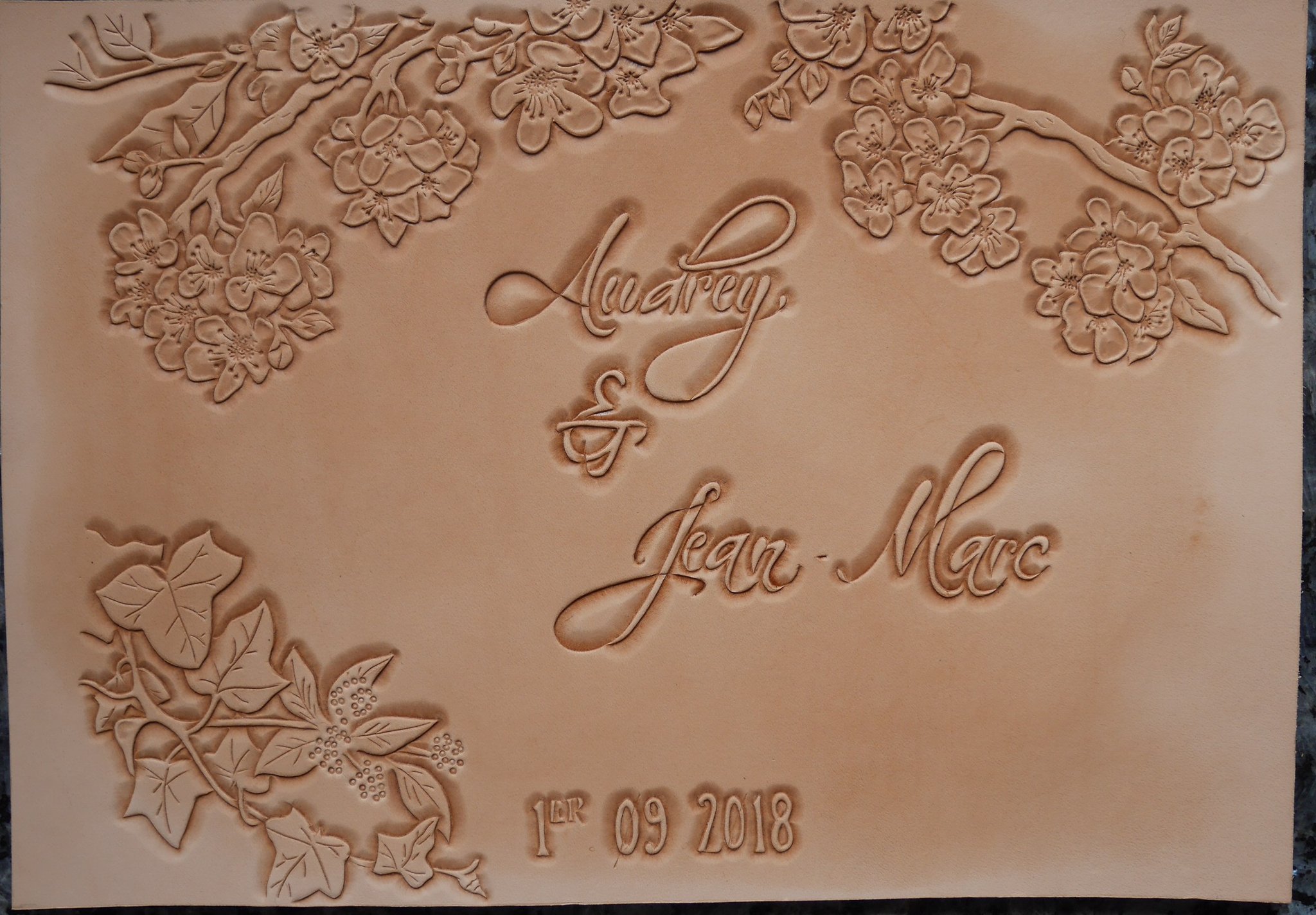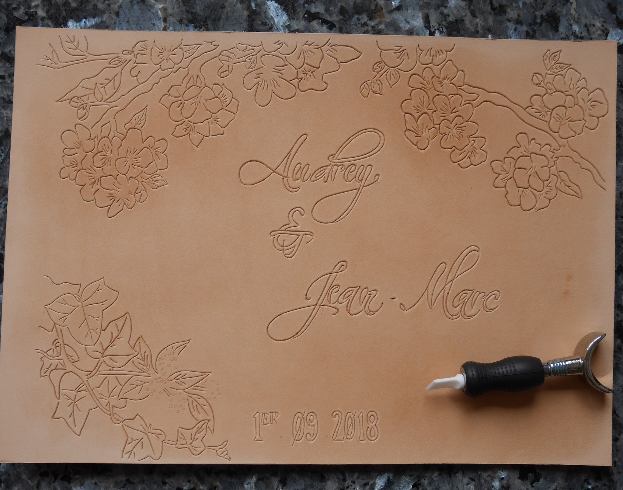 Voici un livre d'or réalisé au format A4 conçu selon les indications des clients. Les motifs reprennent les éléments décoratifs présents sur les faire-parts.