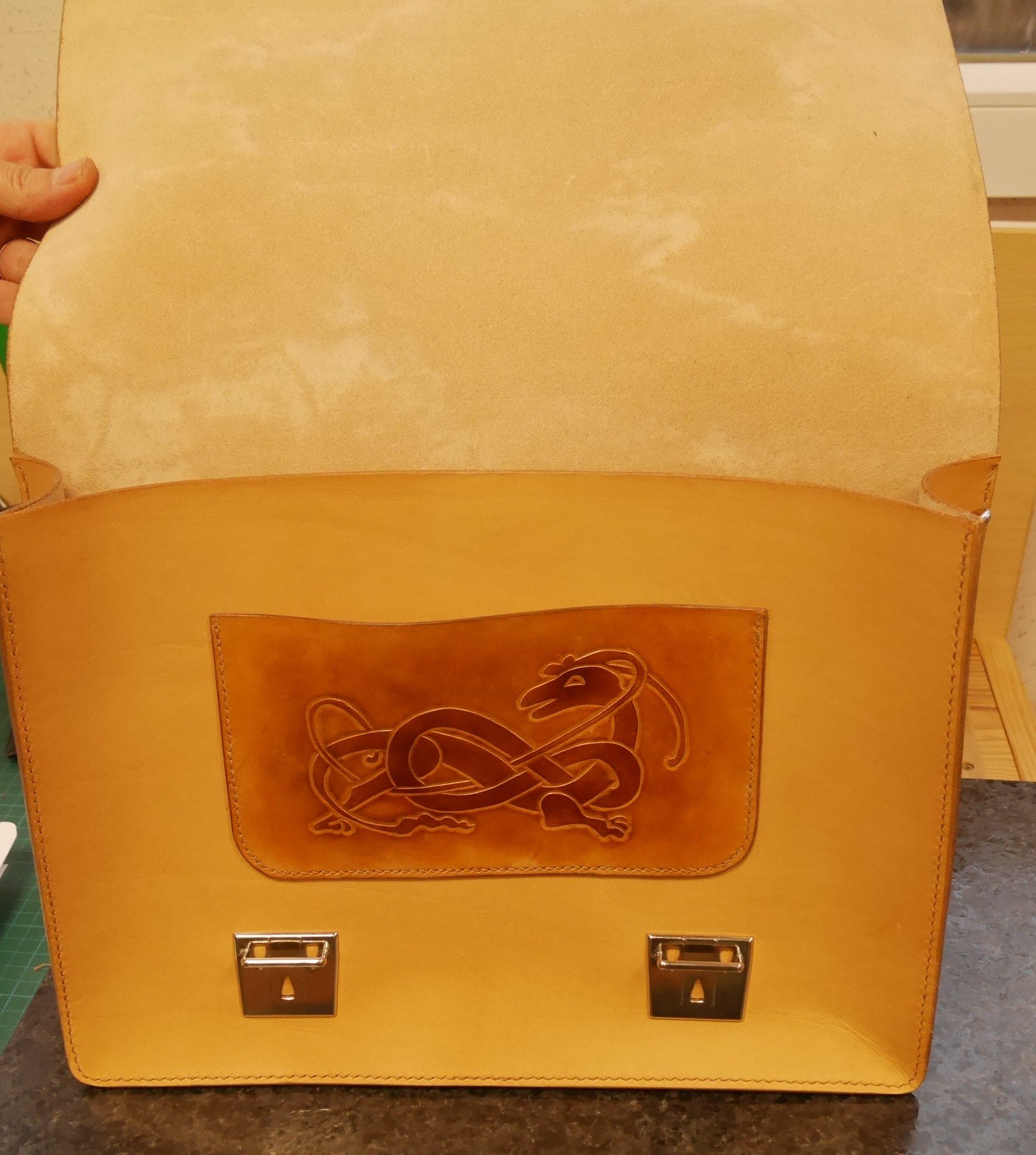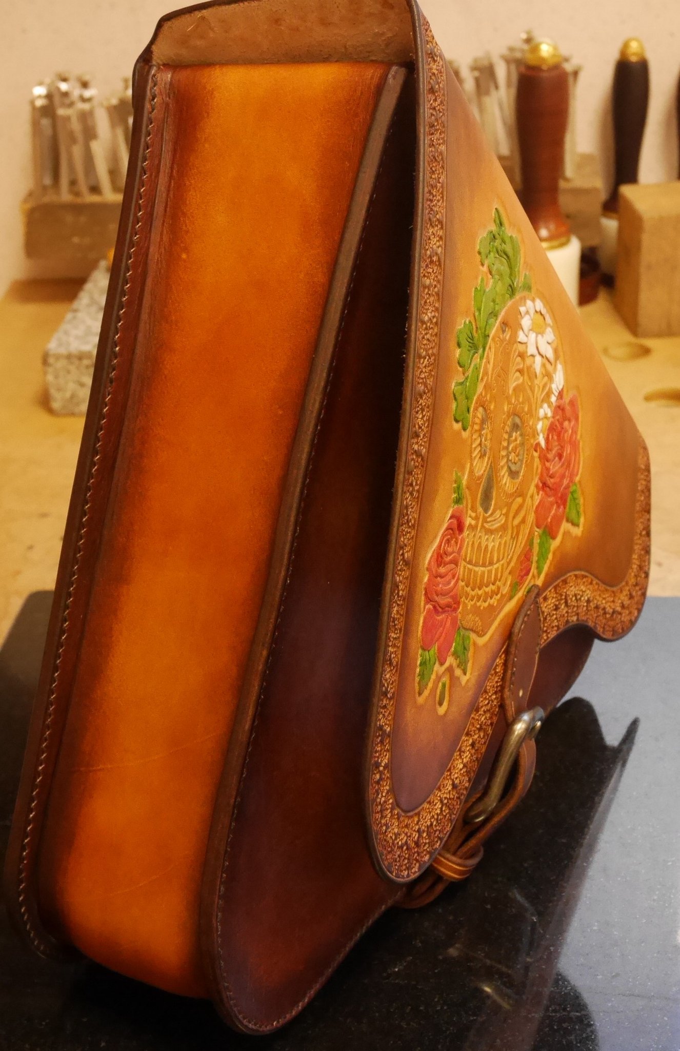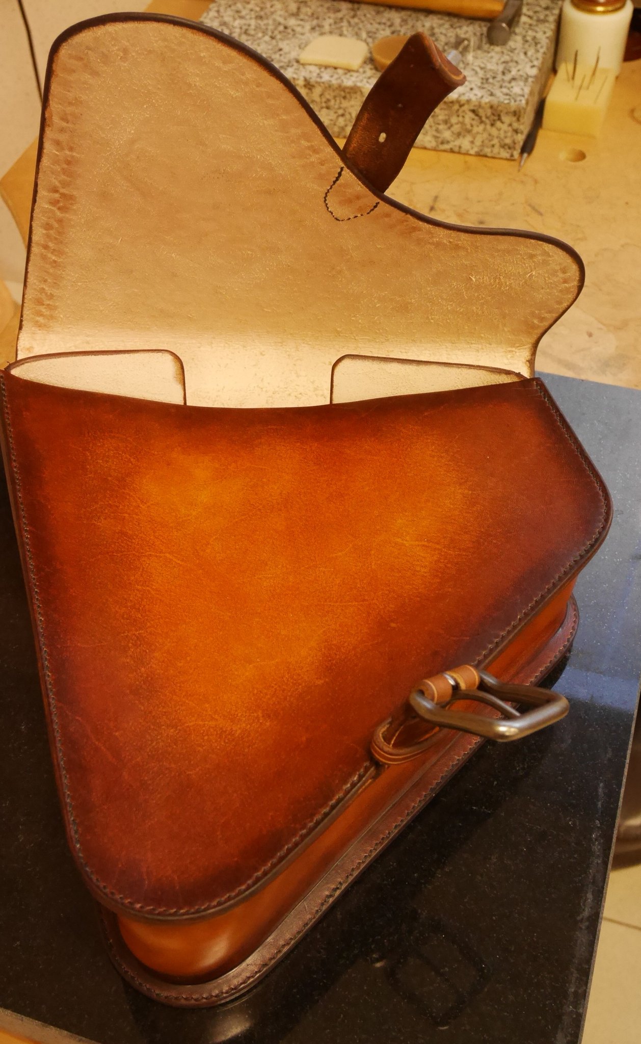 Tout est réalisé en cuir tannage végétal, teinture base aqueuse, couture main point sellier.