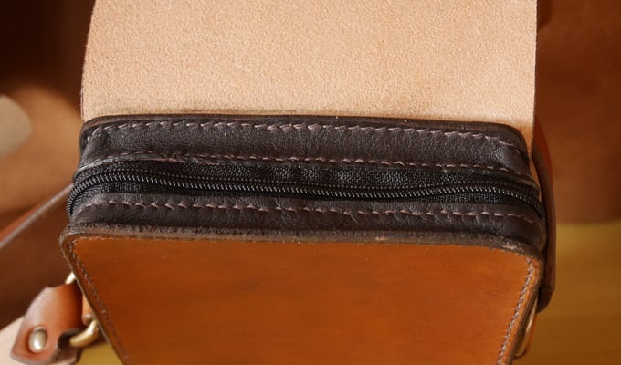 Fermeture sur le haut à l'aide d'une fermeture à glissière et le rabat se ferme à l'aide d'un top magnétique.