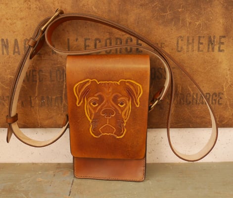 Voici un sac réalisé sur commande avec le repoussage d'une tête de boxer.
