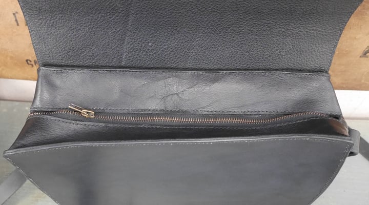 Sac avec sangle réalisé par Vincent. Il est composé d'une poche centrale avec FAG et d'une poche intérieure accessible dans le dos par une autre FAG. Rabat amovible avec incrustation et repoussage. Soufflet en cuir tannage végétal foulonné.
