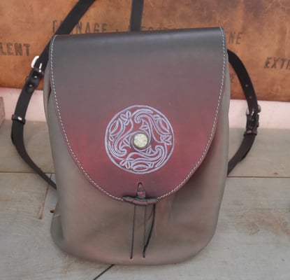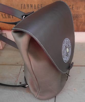 Sac à dos réalisé par Catherine en cuir au tannage minéral et végétal. Repoussage et incrustation de turquoise.