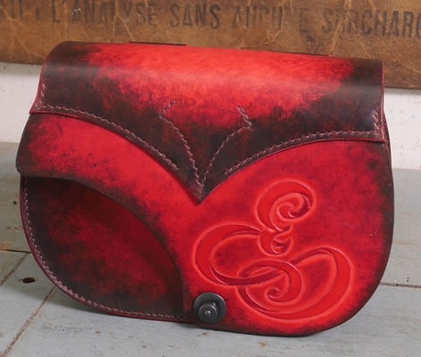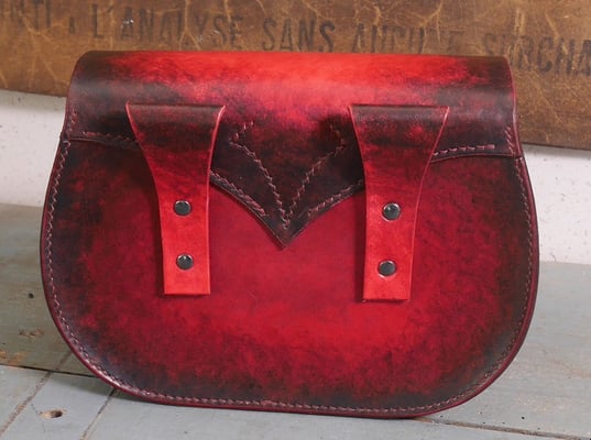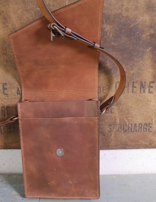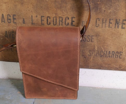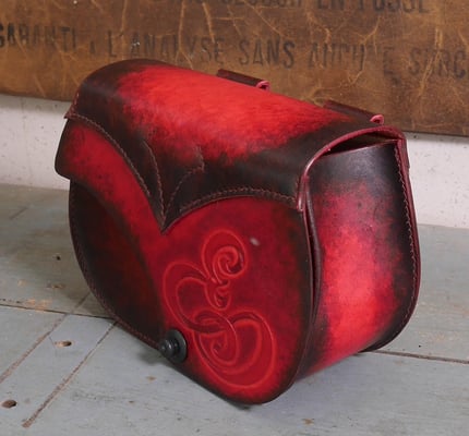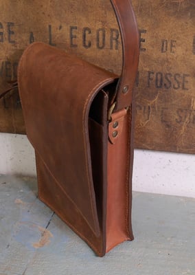 Après son étui de couteau Aurélien a réalisé un très beau sac en cuir tannage végétal de la tannerie Radermecker. Couture main point sellier (fil au chinois brique), repoussage d'une