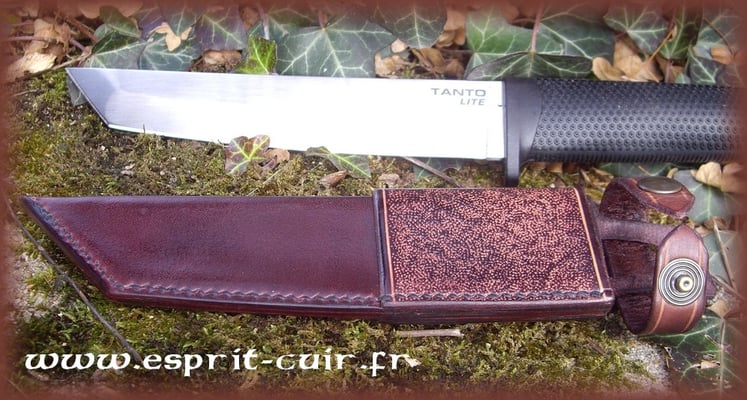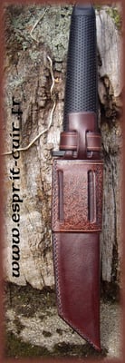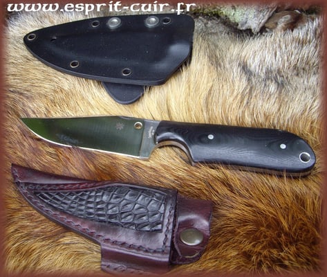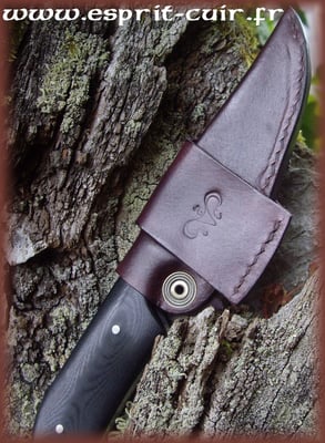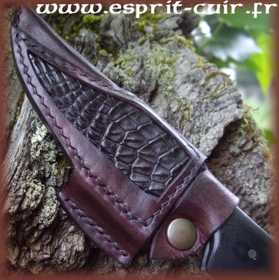 Voici un étui (avec passant pour un port horizontal) réalisé en cuir végétal et peau de crocodile. Cette incrustation rappelle la forme de la lame.